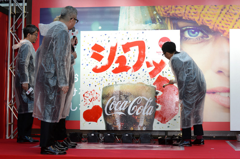 The members of RIP SLYME completed a piece depicting bubbles bursting on a canvas featuring a Coca-Cola bottle. Ryofu wrote the dynamic character "感" (kan, meaning "feeling") on a panel. Ryofu explained it expressed the thrill he felt when drinking Coca-Cola for the first time. The two members of Trendy Angel performed a comedy routine using Coca-Cola as their material, showcasing the skills of the "M-1 Grand Prix 2015" champions. The stage was filled with a warm atmosphere and laughter throughout, celebrating the launch of the new campaign.