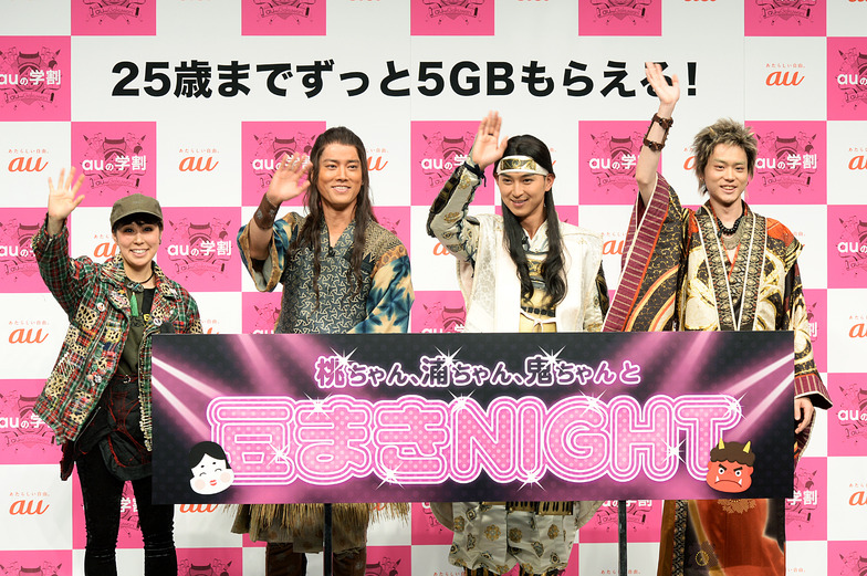 KDDI held the event "Momo-chan, Ura-chan, Oni-chan and Bean-Throwing NIGHT" at Ebisu Garden Hall in Meguro Ward, Tokyo, on February 3rd, Setsubun Day. Actors Shota Matsuda (Momo-chan), Kenta Kiritani (Ura-chan), and Masaki Suda (Oni-chan), who star in KDDI's popular au TV commercial series "Santaro Series," interacted with about 200 student fans.