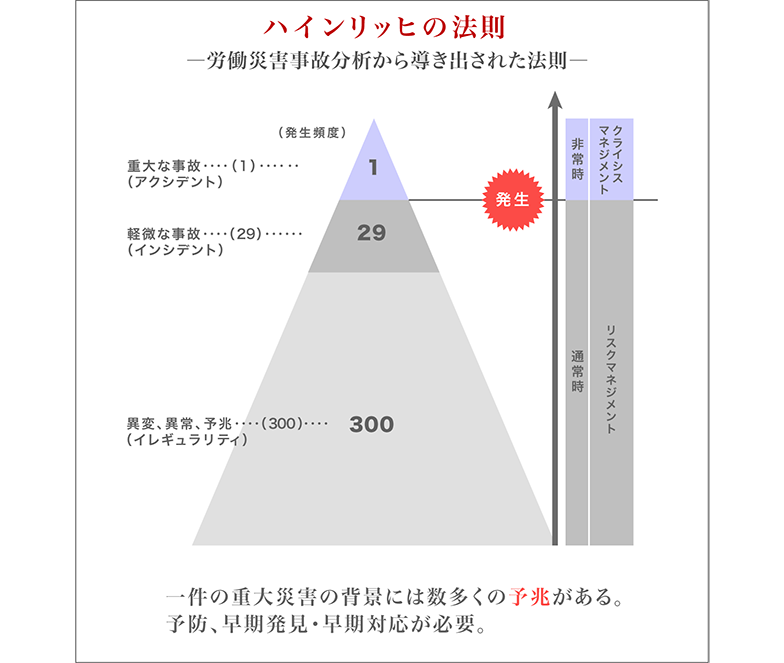 Risks cannot be completely eradicated. As the well-known "Heinrich's Law" indicates, preventing major scandals that could shake the company's foundations requires detecting precursors or minor anomalies as early as possible and responding/addressing them promptly. These precursors and anomalies are called "near misses" and are invariably covered in crisis management textbooks. This term refers to those small incidents during work that make you think "Whoa, that was close!" or give you a start. Organizations entrusted with human lives, such as hospitals and transportation companies, enforce very strict reporting of these near misses.
