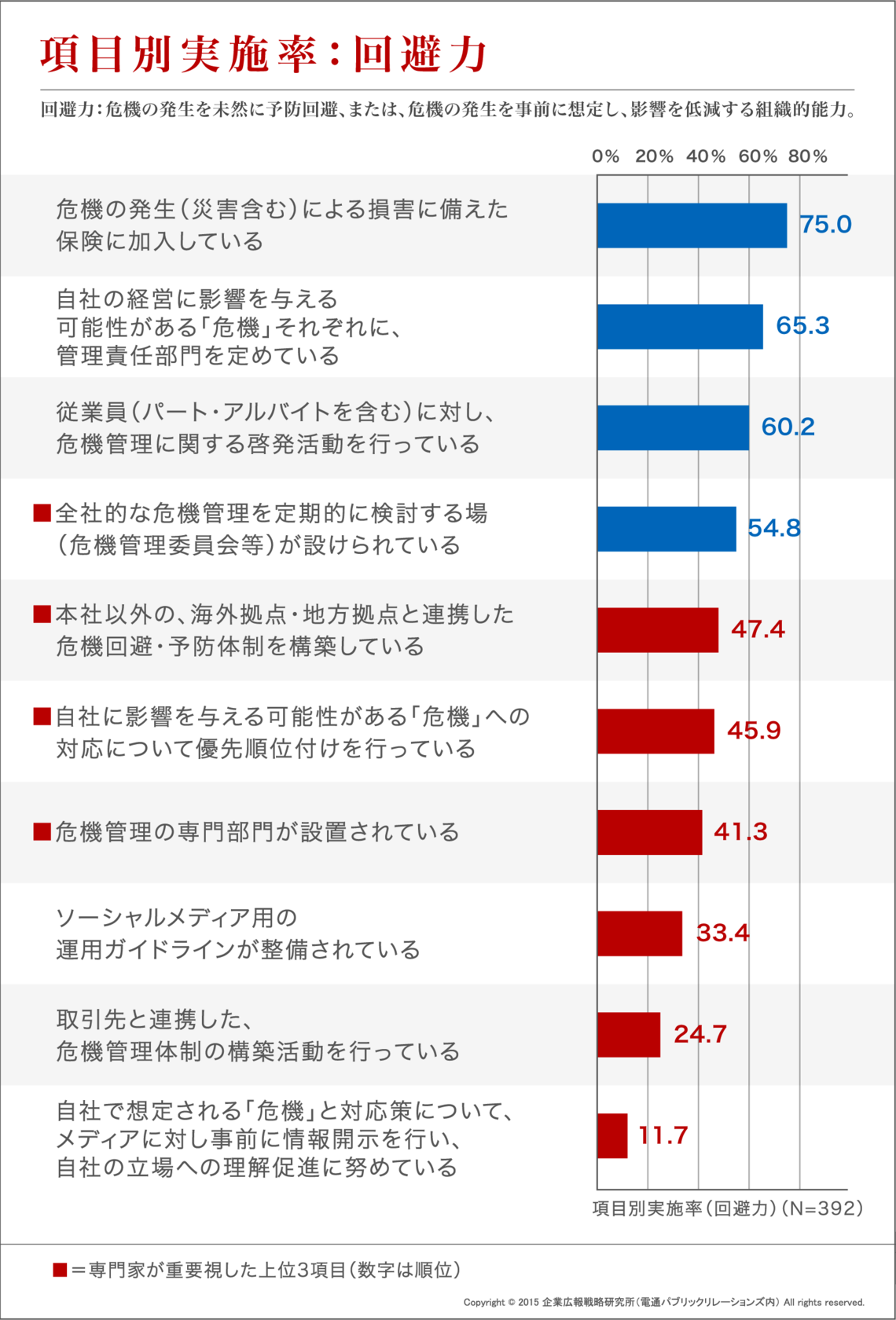 Now, in the "Crisis Management Capability Survey" conducted by our institute last January, the "avoidance capability" among the "five crisis management capabilities" we've previously introduced showed a relatively high score. Particularly in the "Electricity and Gas" sector, it achieved the highest score among industries at 77 out of 100 points. Among the 10 items measuring this "Avoidance Capability," crisis management experts identified the following four items as particularly important (listed in order of importance):