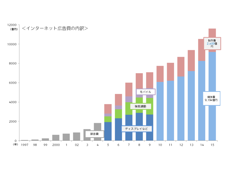 Here's how we've summarized the 2015 internet advertising expenditure and its trend since 1997.
