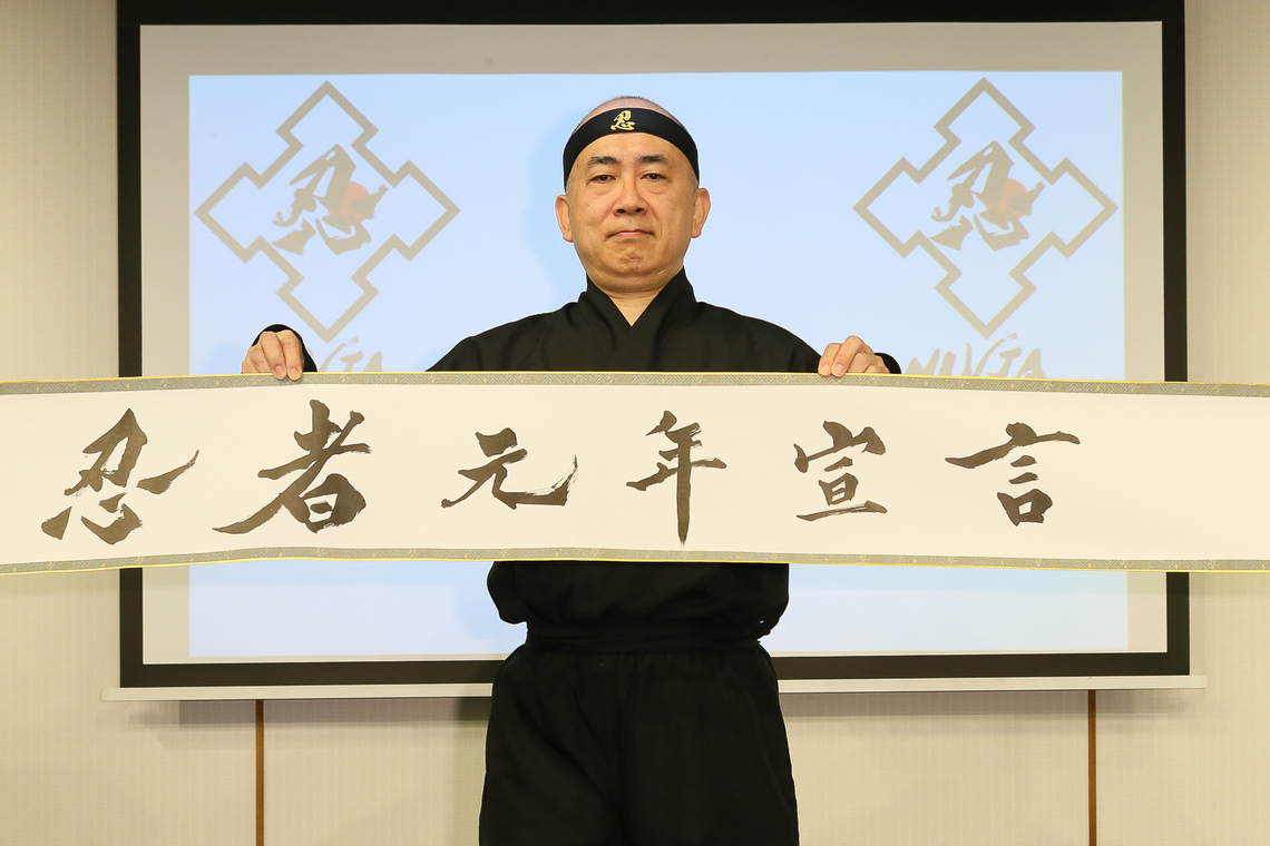 Following this, Vice Chairman Mizobata read aloud the declaration: "Gather, ninjas of Japan. Now is the time to unleash ninja power upon the world. Ninja Nippon Project!" He powerfully proclaimed the "Ninja Year One Declaration."