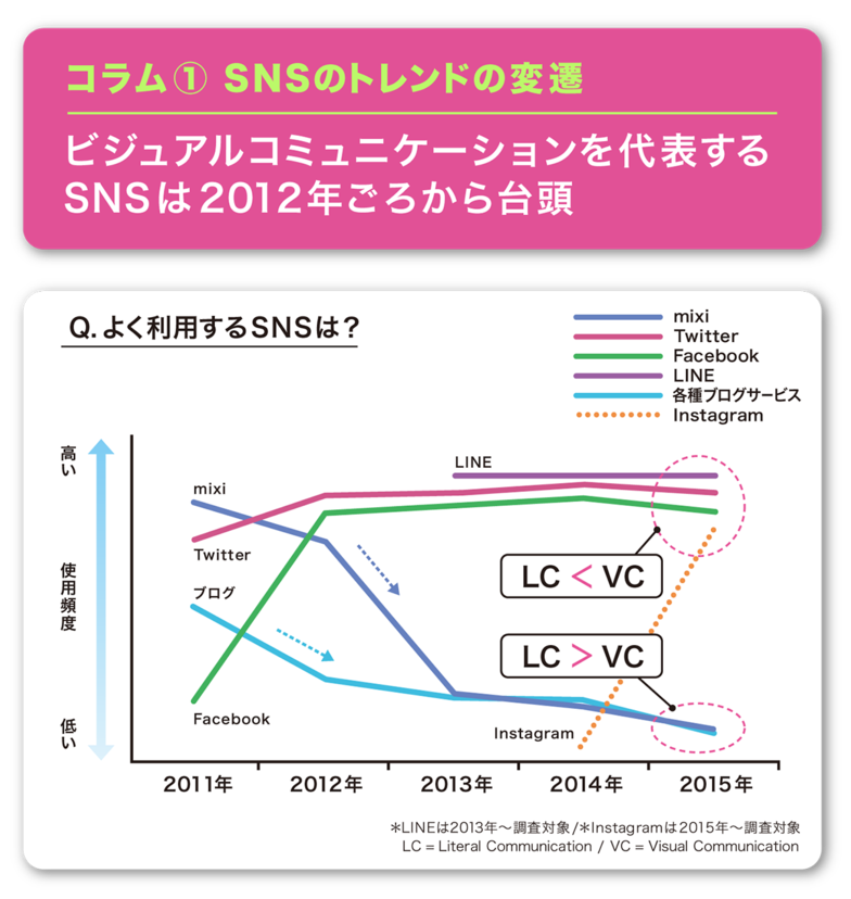 As a result, while blogs and text-centric SNS were once popular, usage has shifted to SNS platforms like Instagram, Twitter, and Facebook, where words play a lesser role. The 'Harejo Committee', an organization of opinion leaders among current female university students, continuously tracks frequently used SNS. Their findings show a sharp decline in users of text-centric services between 2012 and 2013, with visual-centric services (see Column ①) becoming mainstream.