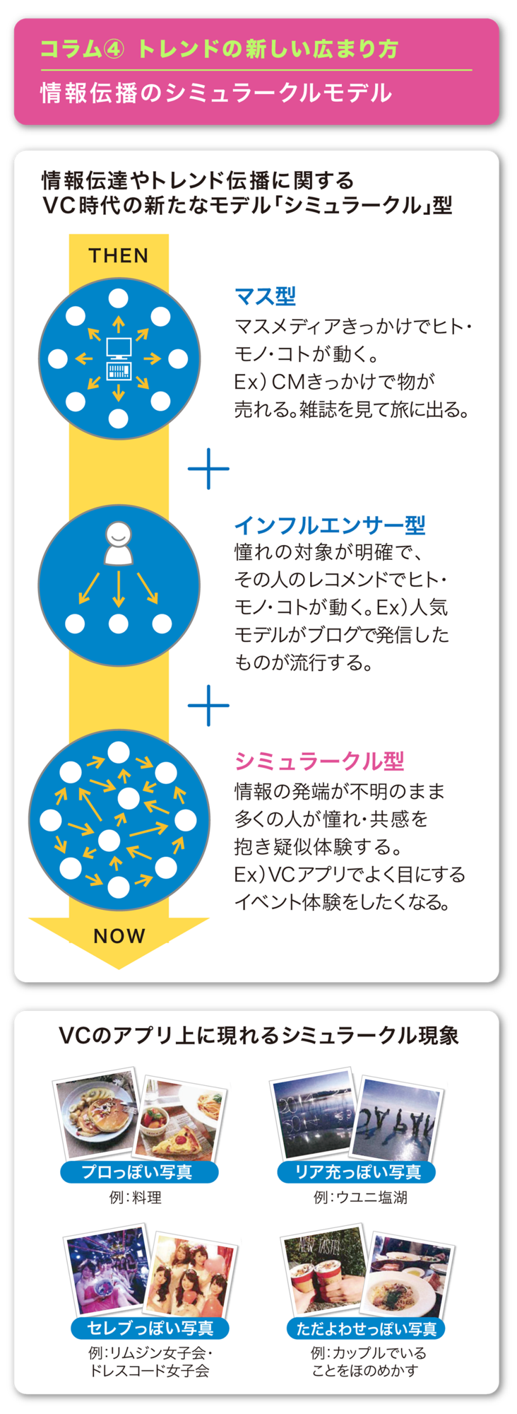 "While it's unclear who started it, a pattern of photographic styles everyone wants to emulate has emerged. This trend increasingly translates admiration and interest into consumer behavior (see Column ④). Unlike the conventional "mass model" and "influencer model," where information is disseminated and spread from a single point, causing people, things, and events to move, a new model of information transmission called the "simulacrum model" has emerged, in which the original source of information remains unknown, and before we know it, many people empathize with and copy the experience. The important thing is that these three models do not transition in a linear fashion, but rather coexist. In the sense that they occur in parallel, the points that stimulate consumer desire are becoming more diverse and frequent. (Dentsu Inc.)