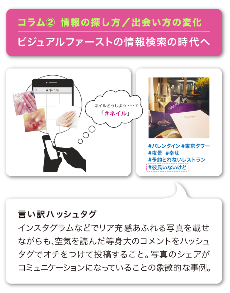 We should also note how young people's information-sharing styles have changed as communication on smartphones shifted from text to visuals. Until a few years ago, daily logs were predominantly "diary-style," expressing thoughts through words on blogs. Now, they've evolved into "album-style," centered on photos and videos. A notable characteristic here is that the words accompanying photos posted rarely express genuine emotions (especially negative ones), focusing instead on concise facts. This can be seen as a consideration for the audience, characteristic of young people born and raised in an era of "reading the air." A symbolic example reflecting this aspect is the "excuse hashtags" frequently seen on Instagram lately (see Column ②).