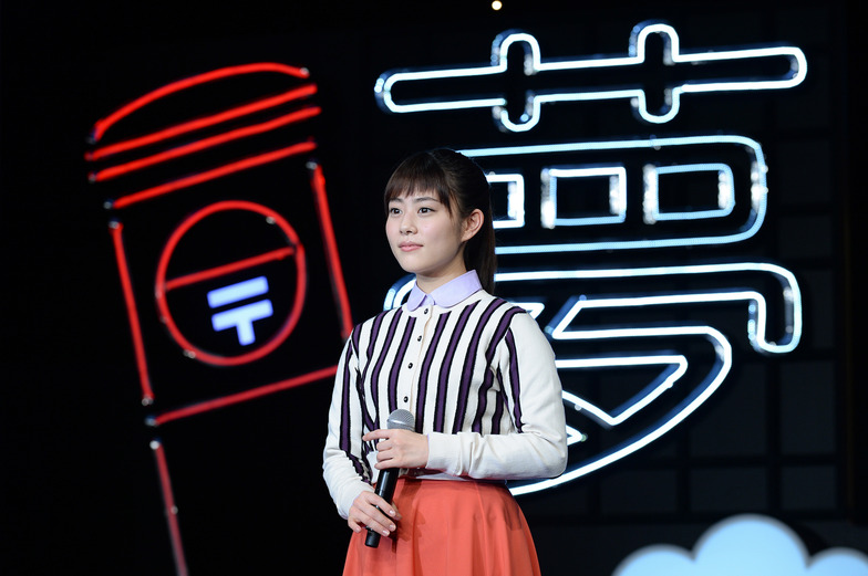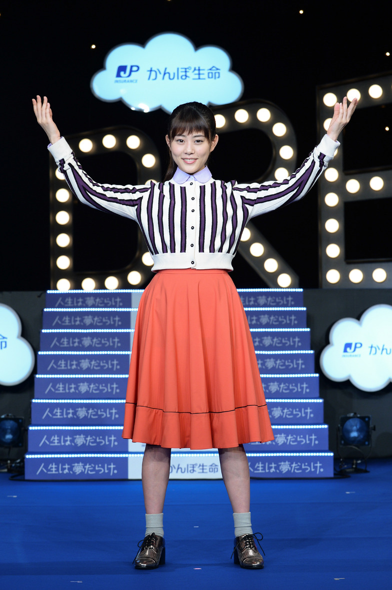 After the commercial aired, panels on the stage opened to reveal a sparkling set with lights, just like in the commercial. Takahata appeared, backed by dancers. A longtime fan of the company's commercials, she said, "Coming from a musical background, seeing the set made me excited. I'm happy to be part of it." She added that becoming a stage actress, her childhood dream, made her think, "I think I've had a good life." She made the audience laugh by attributing the power to fulfill dreams to "grit and determination," then shyly revealed her future dream is "to become a mother." She concluded, "I'd be happy if everyone could feel the importance of living without forgetting the worldview and curiosity shown in the commercial."