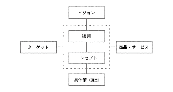 This book organizes physical thinking along two axes. One is the management axis, which seeks connections by "solving problems with concrete concepts to realize a vision." The other is the communication axis, which aims to move the target audience's feelings (by solving problems with concepts) and connect them to products or services. Physical thinking combines both: the "logical" approach centered on the brain, like the former, and the "intuitive" approach centered on the body, like the latter.