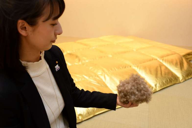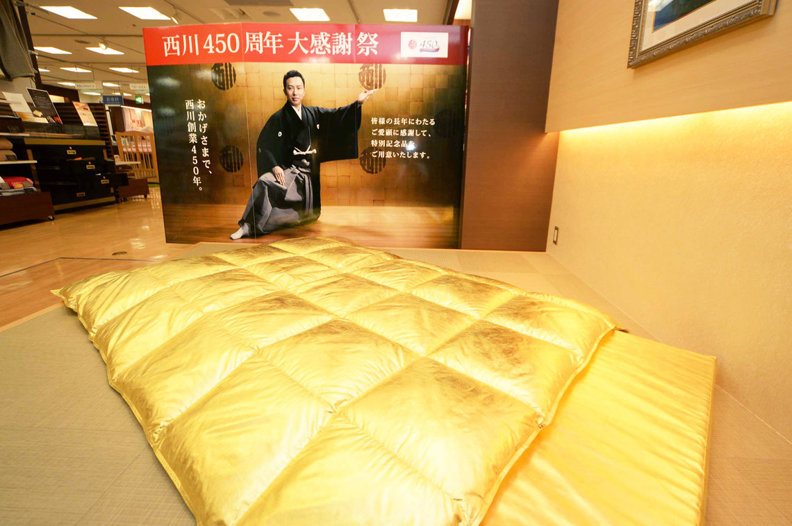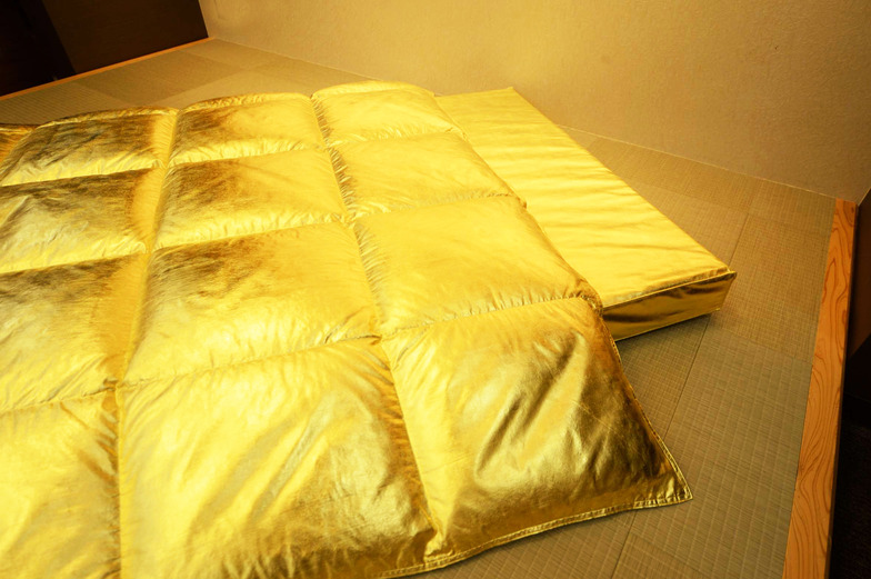 The "Golden Futon" is a set of a down comforter and mattress pad entirely covered in high-quality Kanazawa gold leaf. The comforter uses rare Icelandic eiderdown, highly prized worldwide. The actual "Golden Futon" can be viewed at Nihonbashi Nishikawa in Chuo Ward, Tokyo, until March 13.
