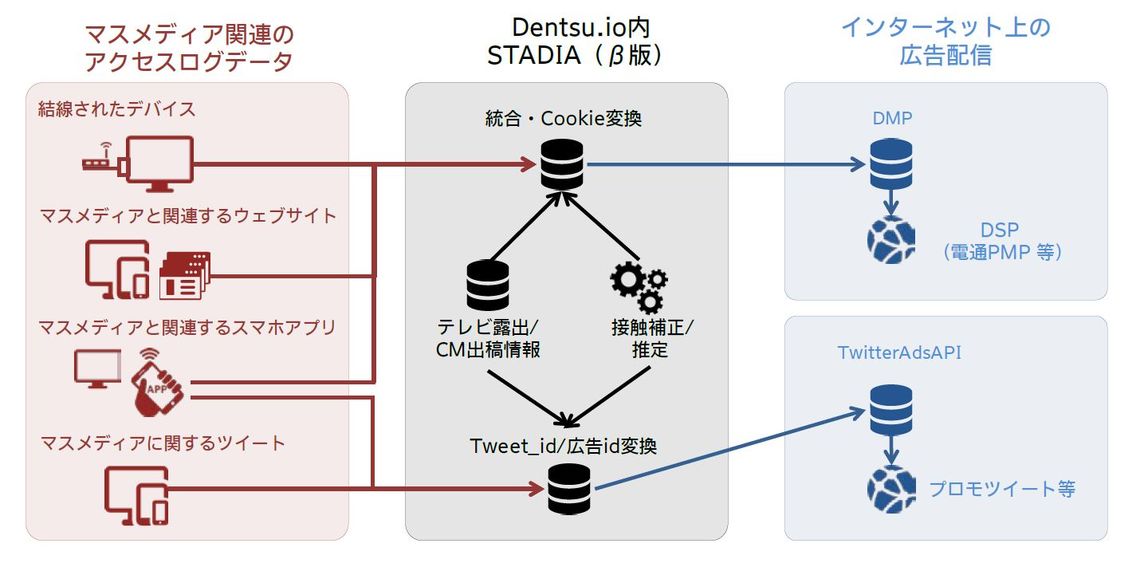 On March 4, Dentsu Inc. announced the development of "STADIA (β)" (STADIA Beta), an integrated marketing platform that maximizes the synergistic effects between mass media and web advertising by cross-referencing access logs estimating mass media exposure with web audience data (Cookie ID/Advertising ID/Twitter User ID), thereby providing new value.