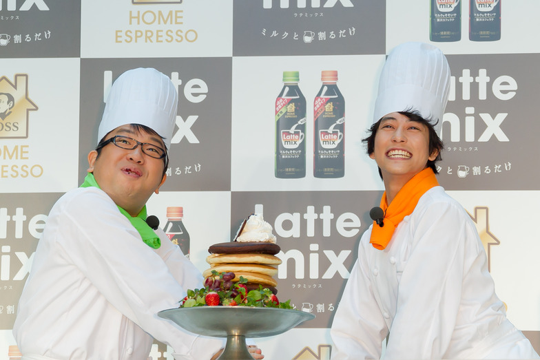 Next, Hiroyuki Amano of the comedy duo Cayin and actor Gaku Sano, who appear in the product's promotional web video "Him, Home Cooking, and Café Latte," took the stage. They reminisced about the filming while chatting.