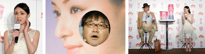 At the venue, the new TV commercials "Supermarket" and "Beauty Drinks"—set to air from the launch date—were screened. Actress Chiaki Kuriyama and comedian Kanning Takeyama, who appear in the commercials, took the stage.