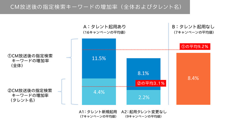 The overall increase in search keywords averaged 11.5% for campaigns featuring new talent and 8.1% for those without a change in talent, showing a difference. Campaigns without any talent saw an average increase of 8.4%, higher than those without a change in talent, but still lower than those featuring new talent. When new talent was featured, the share of talent names within search keywords notably increased, likely driving the overall search increase. This indicates that when a new talent is featured, searches increase using the talent's name as a hook. When introducing a new talent in a TV commercial, it would be effective to create web content beforehand linking the talent to the work, preparing pathways from search. Of course, on the other hand, featuring a talent relatively lowers the proportion of searches for other keywords like the company name or brand name. It is crucial to feature talents aligned with the campaign's objectives.