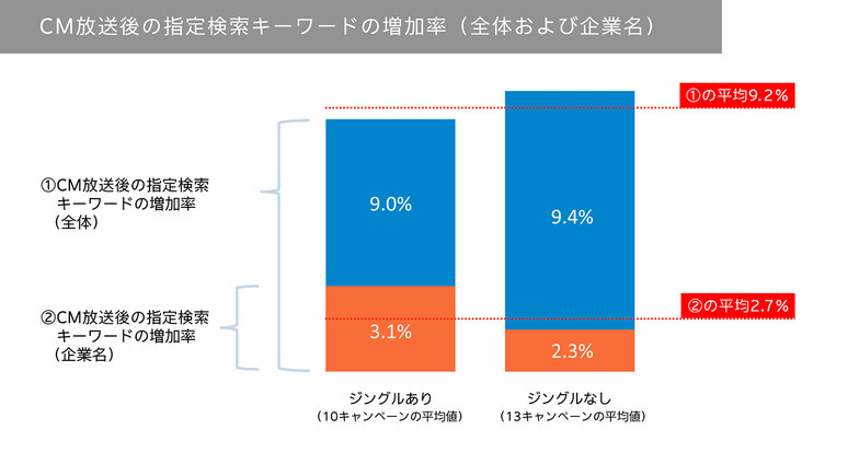 The average increase in company name searches before and after TV commercial airing was 2.7%. When a company jingle was present, the average increase rose to 3.1%, indicating higher search volumes compared to campaigns without a jingle. However, this study found that the overall keyword increase rate was higher for campaigns without a company jingle.