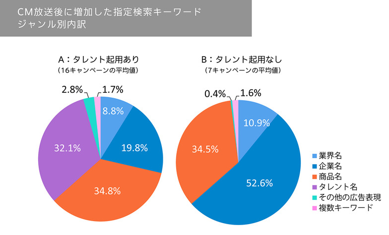 For Campaign A, product names and celebrity names each accounted for over 30% of the search increase. For Campaign B, company names accounted for over half, followed by product names. In both cases, single keywords accounted for over 90% of the search increase. This indicates that searches combining multiple keywords were very rare among the search increases following TV commercial airings.