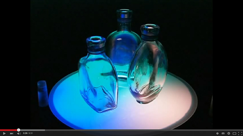 musicBottles. One of Professor Ishii's signature works, embodying "tangible bits" that connect digital information to a physical interface you can touch. Opening the glass bottle's lid plays music (click the image to view a video on another site).