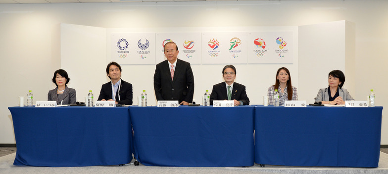 Attending the press conference, from left: Committee Member Izumi Hayashi (Attorney), Committee Member Tsuyoshi Natsuno (Keio University Professor), Secretary General Toshio Mutō, Committee Chairperson Miyata, Committee Member Ai Sugiyama (Sports Commentator), Committee Member Aki Taguchi (Japanese Paralympic Shooting Team Member)