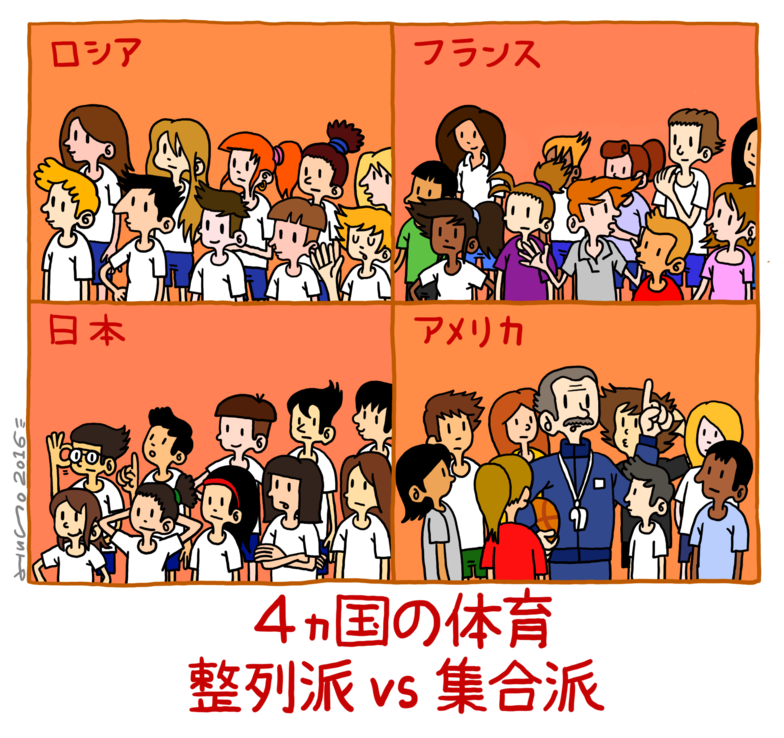 Come to think of it, when I transferred to a French elementary school, they didn't even have the concept of lining up, let alone gym uniforms or a gymnasium. Instead, we changed into comfortable clothes suited for whatever sport we were learning that period and went together to the appropriate facility: the pool, a court, a park, the schoolyard. Here too, the focus was on moving our bodies, with few competitive sports.