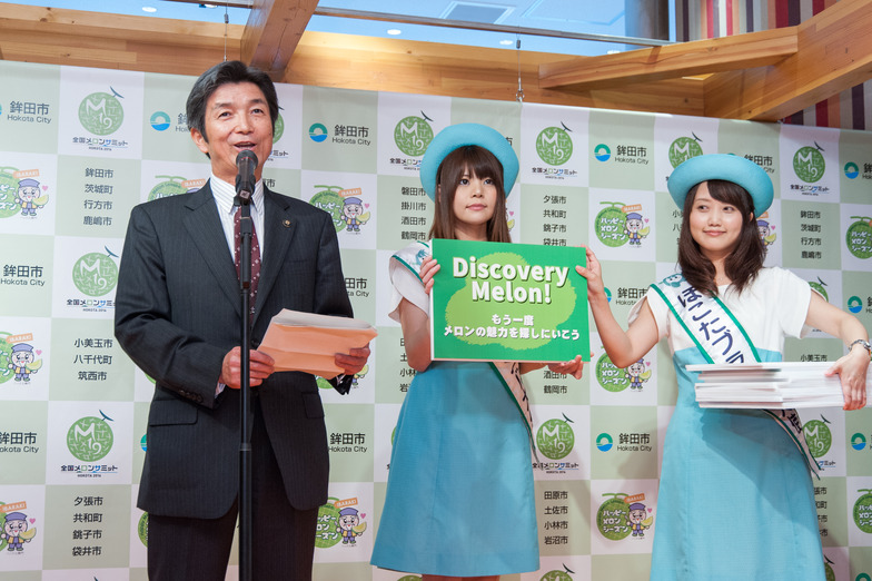 Mayor Hohei Onizawa of Hokota City, who took over from Mayor Hideyuki Harada of Fukuroi City, explained the current state of melons, once called the king of fruits. Due to the emergence of other fruits and sweets, production volume, consumption, and cultivated area have decreased, and the aging of producers is also significant. He expressed a sense of crisis, stating, "Melons are an endangered species, and in the near future, melons may no longer be available to eat in Japan." He then said, "I hope the Summit will help people rediscover melon's appeal. It's 'Discovery Melon!'"