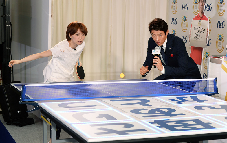 Ishikawa and passionate campaign supporter Shuzo Matsuoka took the stage. Matsuoka immediately fired up the crowd with his passionate coaching: "Feel Rio! Feel the Olympics!" Ishikawa then challenged a "table tennis version of strikeout" with the commercial airing at stake. Unfazed by Matsuoka's pressure, she successfully served the ball onto all nine characters spelling "Thank you, Mom."