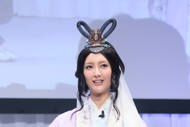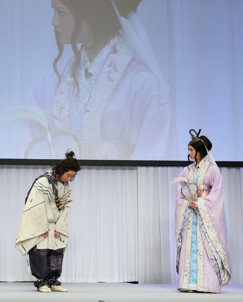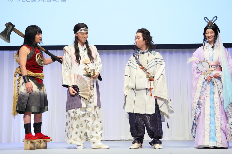 Actors Shota Matsuda (playing Momotaro), Gaku Hamada (playing Kintaro), and actress Nanao (playing Princess Otohime), who star in the "Santaro Series" TV commercials, took the stage.