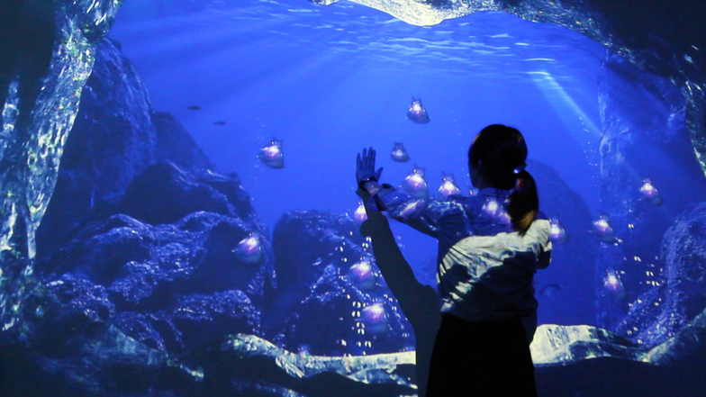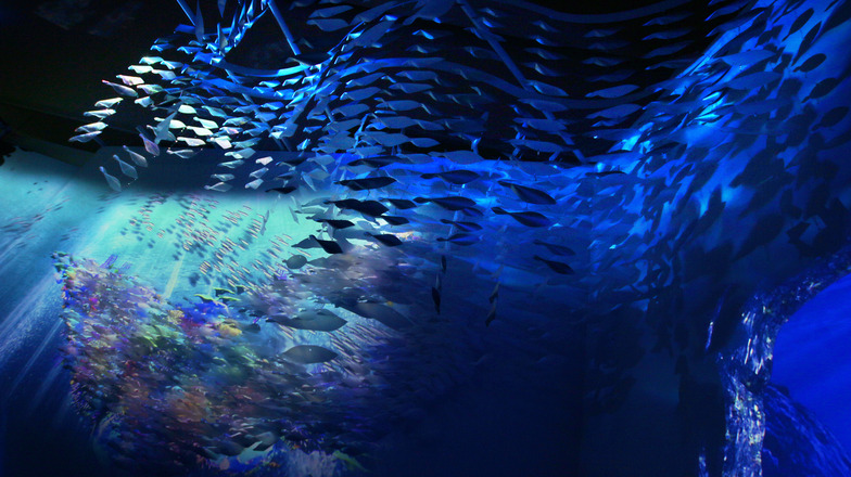 Following the installation of a vast sardine school, two aquariums appear projected onto the walls, as if carved out of them. An interactive display features the sea swallow, a type of pufferfish, that follows visitors' movements. Joined by adorable sea creatures like sea turtles, visitors can enjoy playing with them.