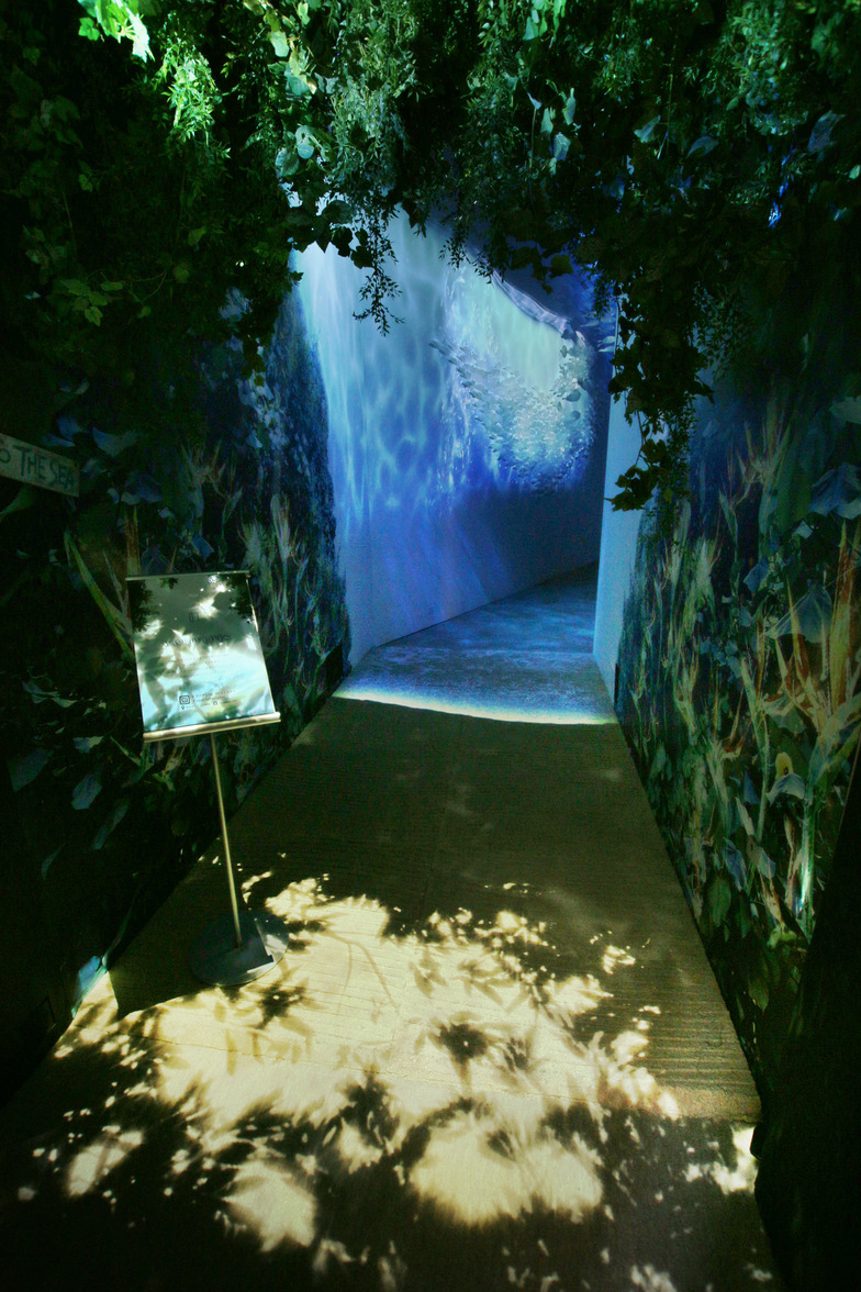 The entrance floor features a beach-like texture, where a world of projected wave imagery and sound unfolds. Sensors detect approaching visitors, triggering interactive elements like light particles—inspired by fireflies—gathering around them. The refreshing aroma of coastal plants further draws visitors into this introductory experience.