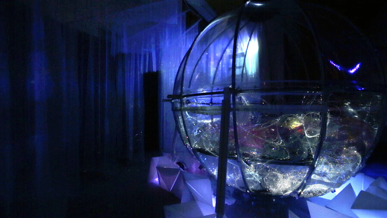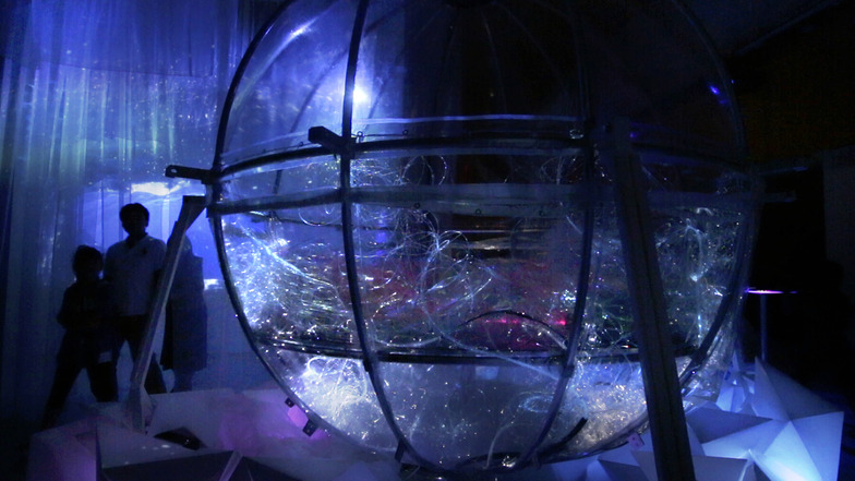 Oasis Gate welcomes visitors to the underwater world with an illumination object display and oasis scents that enhance the atmosphere. The illumination object is a spherical installation where images are projected using fiber optics and projectors, expressing the fantastical world of the deep sea.