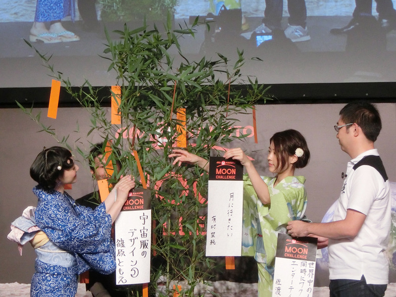 Following this, a video message from Sakanaction, who are performing the support song, was shown. Finally, in keeping with the Tanabata theme, all the panelists revealed tanzaku strips on which they had written their wishes. Their wishes were: "I want to go to the moon" (Arimura), "I want to design a spacesuit" (Shinohara), "Win the Google Lunar XPRIZE" (Hakamada), "Success for the au×HAKUTO MOON CHALLENGE" (Yamada), and "Create entertainment that excites people around the world simultaneously" (Sadoshima).