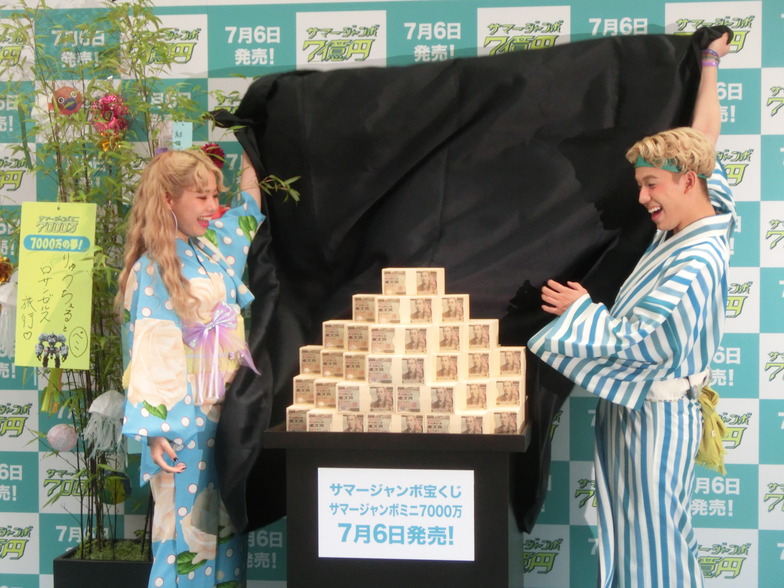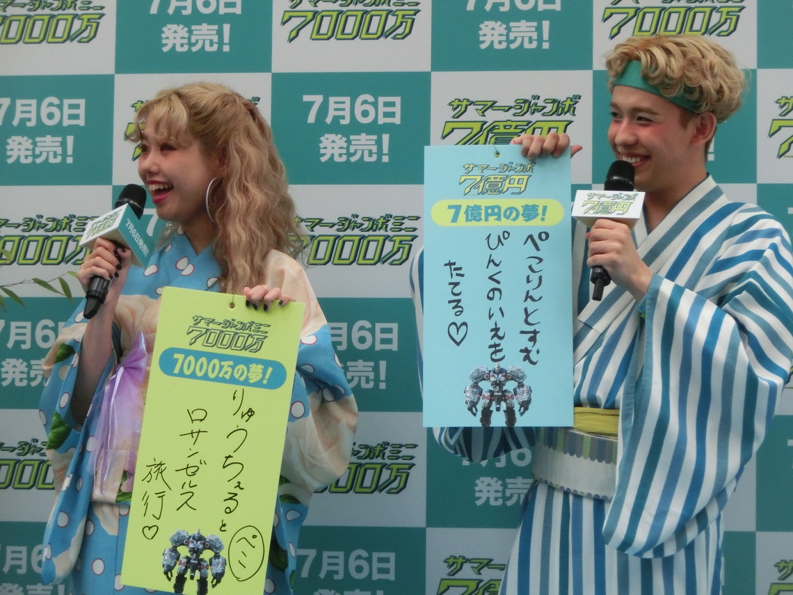 revealing their respective dreams. Furthermore, a replica of 700 million yen appeared at the venue. Excited by the huge pile of money she'd never seen before, Peko exclaimed, "This is crazy. Just thinking this money could come to me makes me tremble!" Ryuchell also reacted in surprise, saying, "If it really came, I wouldn't know what to do. It's so overwhelming." Finally, when asked for a message to lottery fans nationwide, the two shared: "I think the Jumbo Lottery is something that can make dreams come true and give people big dreams. I'm trying it for the first time myself, and I can't stop feeling excited and nervous right now. I want everyone to experience this feeling too, so please give it a try!" (Ryucheru)