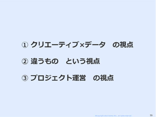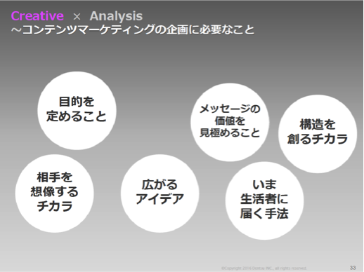 ① From the "Creative × Data Perspective," while creators and analysts team up to advance projects, each role requires the following points and insights: