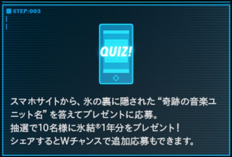 At the beginning of the commercial, freelance announcer Mariko Seyama appeared to explain the concept and encourage viewer participation. After a countdown ended, the TV screen was covered in ice. Viewers tapped their smartphones to break the ice and reveal the hidden "miracle music unit name" behind it.