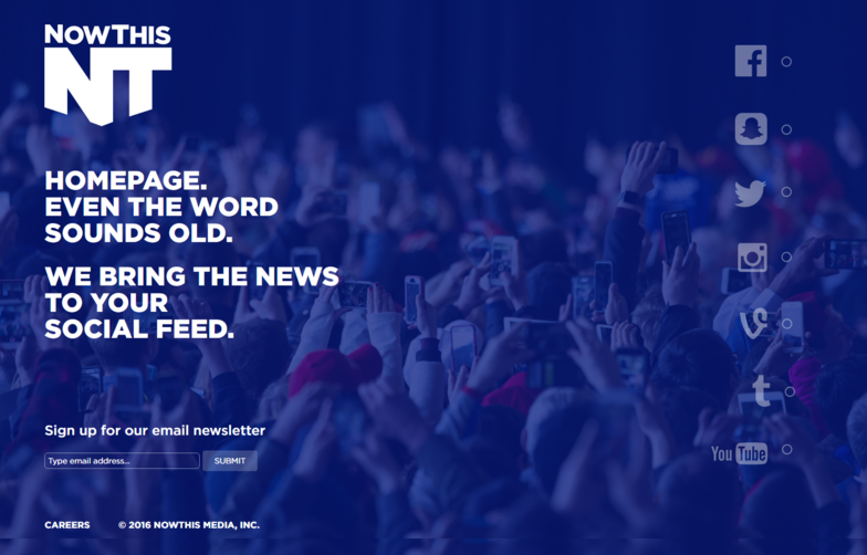 Another example is the news site NowThis. Visiting the site reveals a homepage design that says nothing more than "Home page. Even the word sounds old. We bring the news to your social feed," featuring only links to each platform and absolutely no content.
