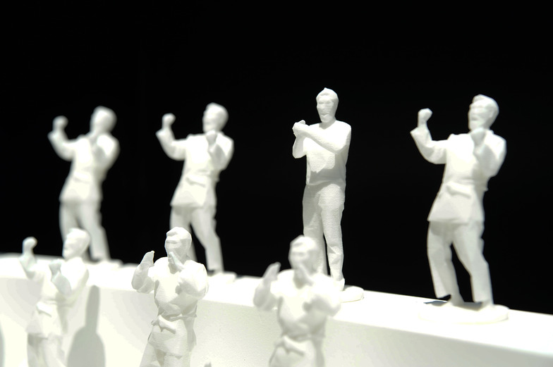 Shinohara introduced 100 small, cheering sculptures modeled after himself in various poses. Some wore judo uniforms, prompting him to joke, "I want to cheer as if I were the athlete myself. Everyone, please don't shoot them with BB pellets just because they're small!"