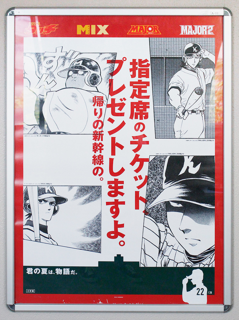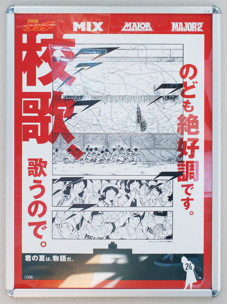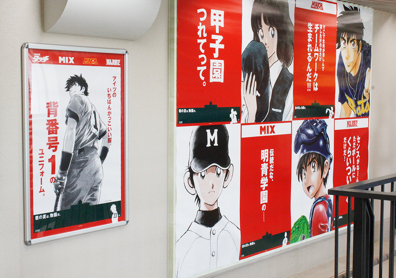 Posters for popular manga like 'Touch' and 'MAJOR' appear at Koshien Stadium
