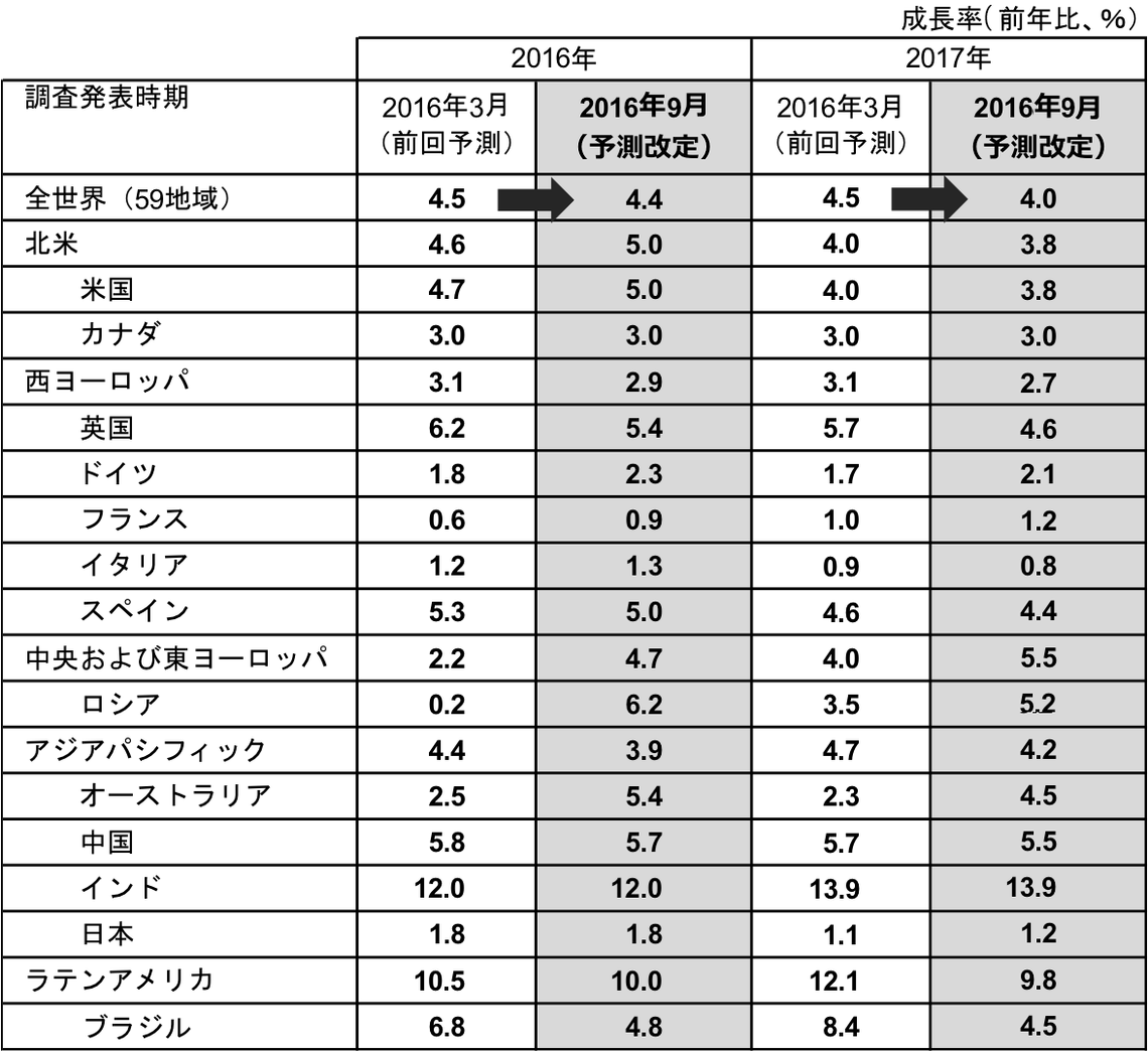 ・Asia Pacific has seen modest downward revisions for both 2016 and 2017, but continues to project solid growth (2016: 4.4% growth → 3.9% growth; 2017: 4.7% growth → 4.2% growth). Strong performers like India (12.0% growth), Vietnam (10.6% growth), the Philippines (9.9% growth), and Australia (5.4% growth) offset the sluggishness seen in Hong Kong (11.8% decline), Taiwan (7.6% decline), and Thailand (5.2% decline). Given differing economic conditions across countries, we expect this variation in growth rates to persist through 2017.