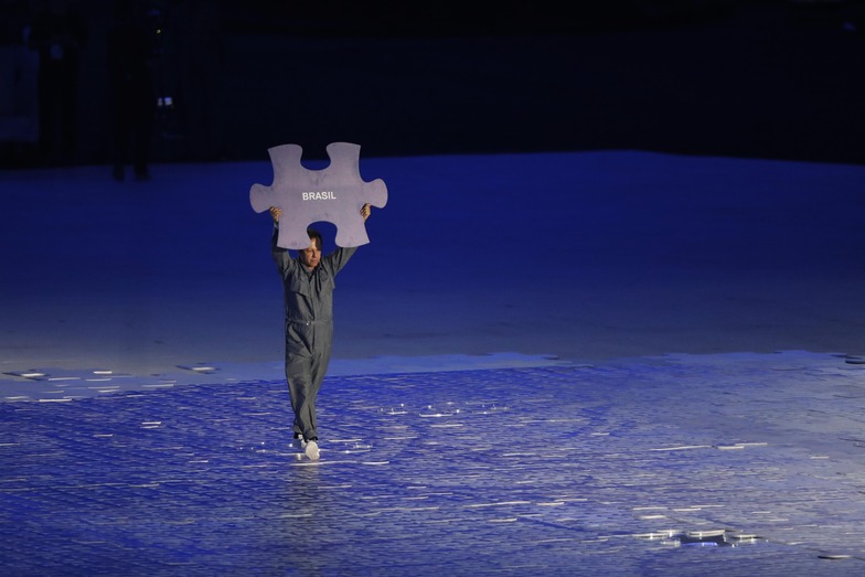 Each national team's placard represented a piece of a jigsaw puzzle. When the final piece, representing host nation Brazil, was placed, it completed a heart shape. Visual effects overlaid this, expressing the pulse of life.