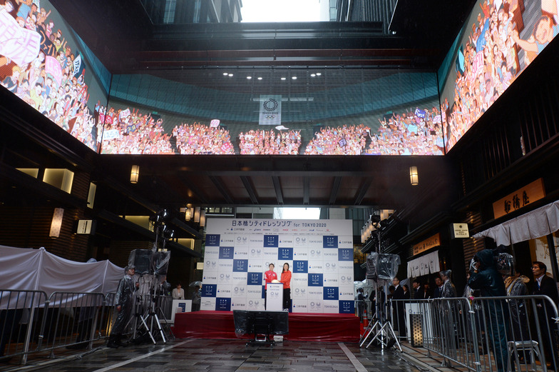 A 9-meter wide by 2.5-meter tall three-sided LED panel has been installed on Nakadori Street between commercial facilities COREDO Muromachi 1 and 2, hosting the interactive event "Go for 2020 Street."