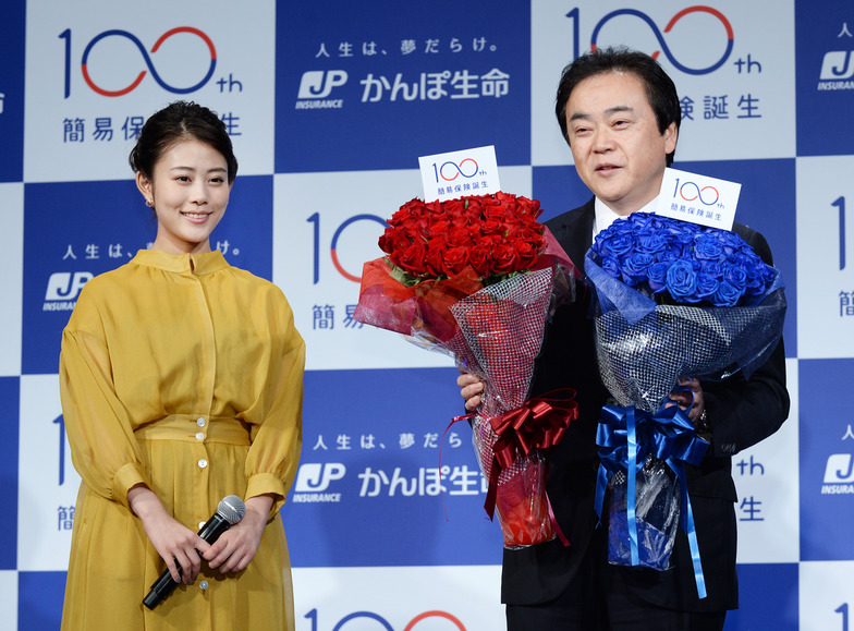 Talent Yoshihiko Inohara, who appears in Japan Post Insurance's TV commercials, and actress Mitsuki Takahata, featured in the corporate advertising series "Life is full of dreams," rushed to the venue to offer their congratulations.