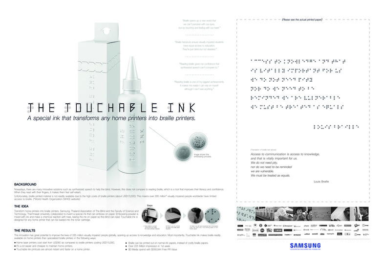 The award-winning entries also demonstrate that design is not merely about beautiful visuals. "THE TOCHABLE INK" by J. Walter Thompson Bangkok, which won the Grand Prix not only in the Design category but also in the Innovation and Healthcare categories, is an ink developed by Samsung Electronics that enables standard home printers to print tactile Braille.