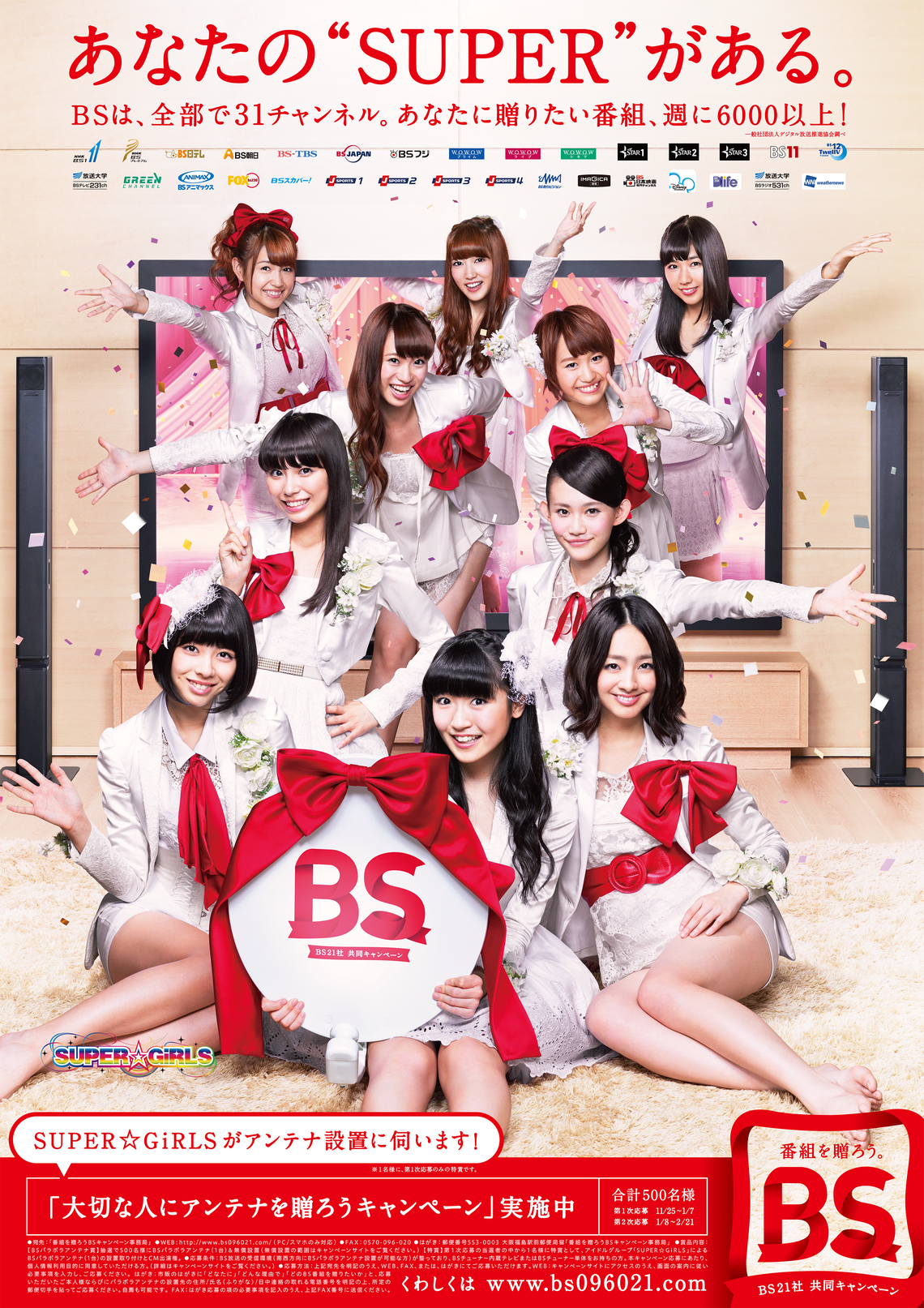 The campaign features idol group "SUPER☆GiRLS" as its character. TV commercials, newspapers, internet, and transit ads will express "the fun of BS broadcasting that seems to leap out of the TV." One winner will receive a visit from SUPER☆GiRLS to install their antenna.