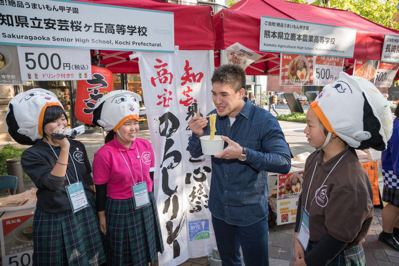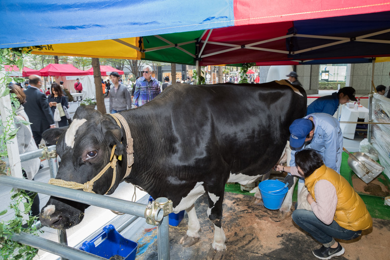 The "Farm Experience Field" recreated a rural scene with rice drying on bamboo racks and scarecrows. Popular corners included vegetable harvesting, milking real cows, and bottle-feeding calves. Companies participating in the "Agricultural Women Project" also exhibited and sold products at their booths. The "Fountain of Japanese Food" offered tastings of dashi and miso, the foundations of Japanese cuisine, along with sales of original foods created by high school students nationwide. Inbound tourists also stopped to show keen interest. The "Forest Overflowing with Regional Products" featured tastings and sales of award-winning items from the "Food Action Nippon Award 2016 " and regional specialties from various areas. The "Market Where Agricultural Products Gather" included a corner where JA sold freshly harvested produce and processed goods shipped directly from production areas.