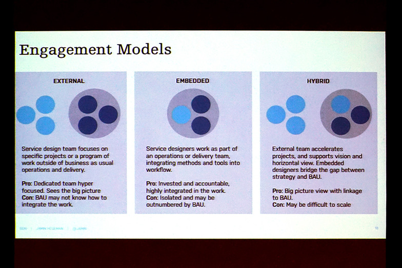 Integrating service design with business operations is no simple task. Jamin outlined an engagement model for service design—external, embedded, and hybrid—summarizing the advantages and disadvantages of each. Naturally, not all agency or in-house service designers can execute large-scale service design initiatives that fully engage the organization and leadership. His model effectively captures the key point of what type of service design to provide.