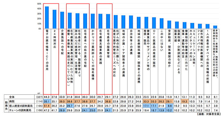 1. While both workplaces and individual pharmacists increasingly express a desire to contribute as key players in regional healthcare, actual communication with patients remains limited to basic medication-related topics. They are not yet able to grasp the "patient's life circumstances," which will be essential going forward. Furthermore, communication levels vary significantly depending on the pharmacy type: "hospital-affiliated," "chain," or "independently owned."