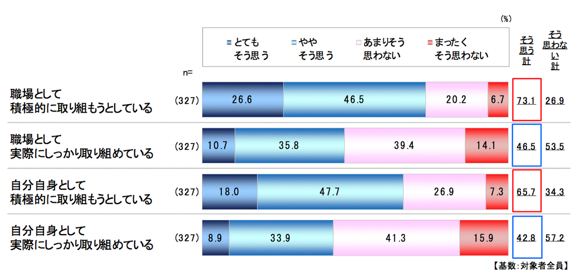 ● However, regarding the current state of efforts, less than half of both workplaces and individuals feel they are "making progress," indicating an overall perception that efforts are "still insufficient."