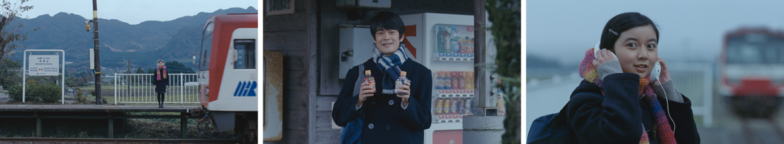 The heroine is played by actress Moka Kamishiraishi, a current high school student. The story unfolds impressively against the backdrop of Miharadai Station and the beautiful, tranquil surrounding scenery, made possible by the full cooperation of the Minamiaso Railway, which currently operates only partial service. The elementary school children and farm women appearing in the commercial are local residents serving as extras.