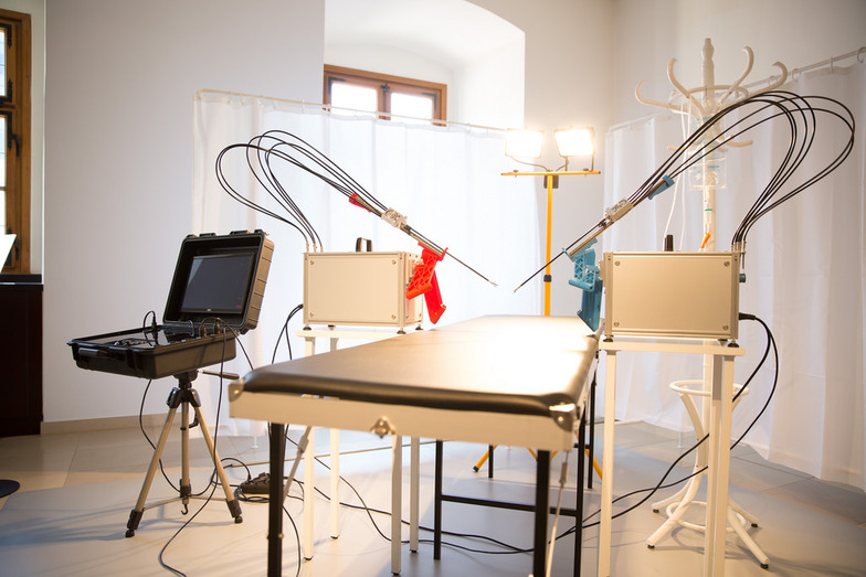 The photo above shows this work, which is essentially a "DIY laparoscopic surgery assistance robot" (made by the artist). As you know, DIY means "do it yourself," and the artist, Frank Kookman, "built" this device for laparoscopic surgery, which requires extremely advanced and precise manufacturing.