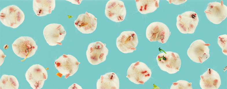 For the shoot, I crafted a large hamster enclosure by modifying acrylic sheets myself. I had the hamster stay inside, photographed it from below with a wide angle, and later rearranged the shots to form the dot pattern. The hamster moved around surprisingly often, making the initial shoot quite challenging, but I eventually mastered baiting it (laughs). The leftover food the hamster dropped also became a nice accent.