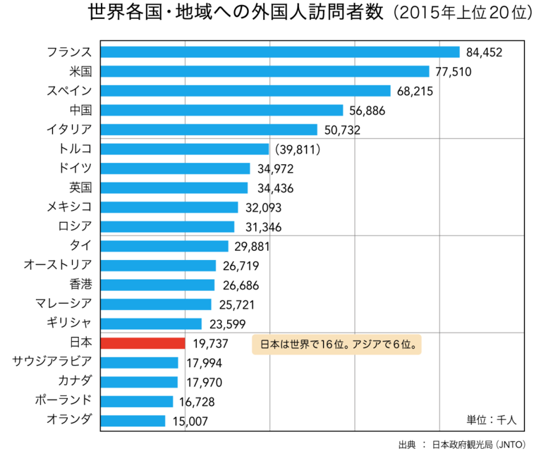 France, the world leader in tourist arrivals, welcomes approximately 84 million visitors annually, while the United States ranks second with 77 million. Japan, however, ranks 16th globally and only 6th in Asia, trailing China, Hong Kong, and Thailand. On the outbound side, the number of global travelers is certain to continue growing steadily, correlated with the economic growth of countries like Southeast Asia and India. This means tourism not only has significant potential for increased inbound arrivals now but is also a market certain to expand in the future.