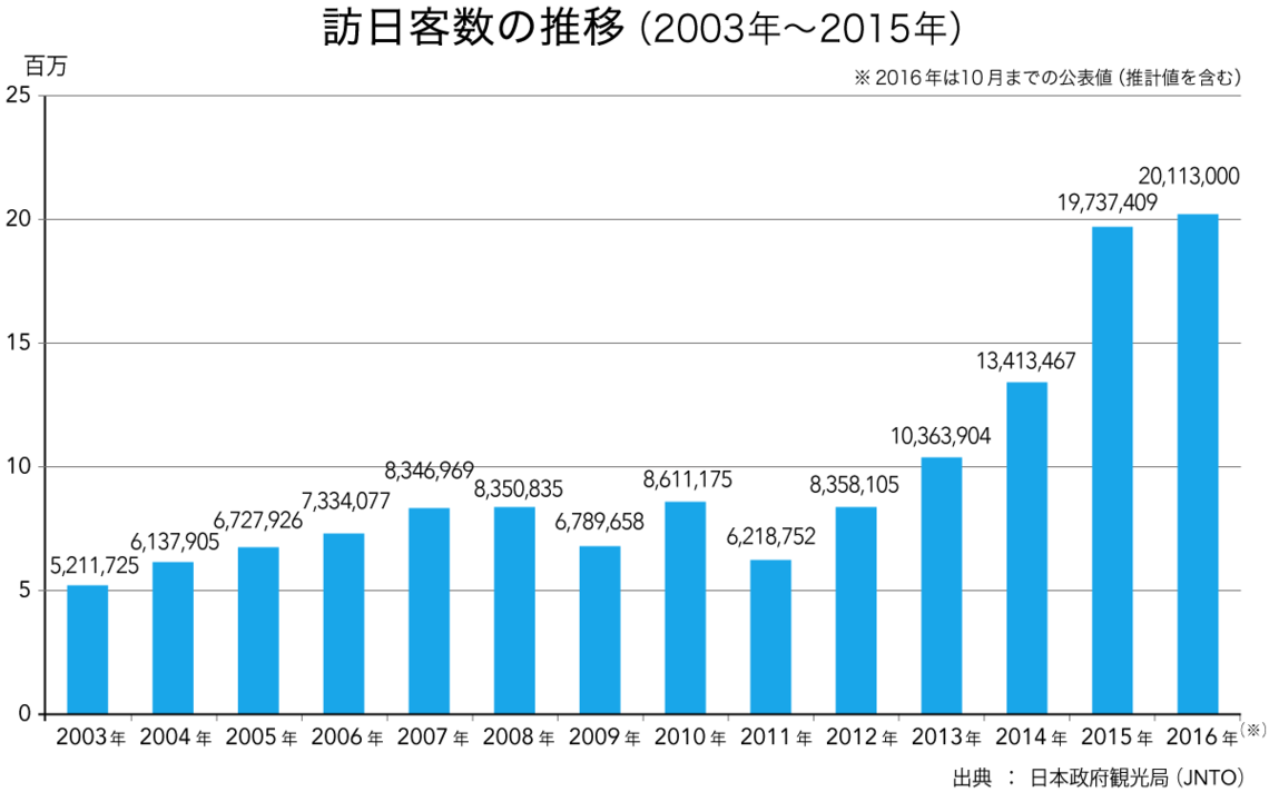 The Japan Tourism Agency set a target of 15 million annual visitors by 2013, but at the time, it seemed a distant goal. However, thanks in part to steady promotional efforts, the number finally surpassed 20 million in October 2016. As the base grew, overseas travelers became more diverse in their destinations, behaviors, and ways of enjoying their trips, propelling inbound tourism into a new stage both in terms of volume and quality.