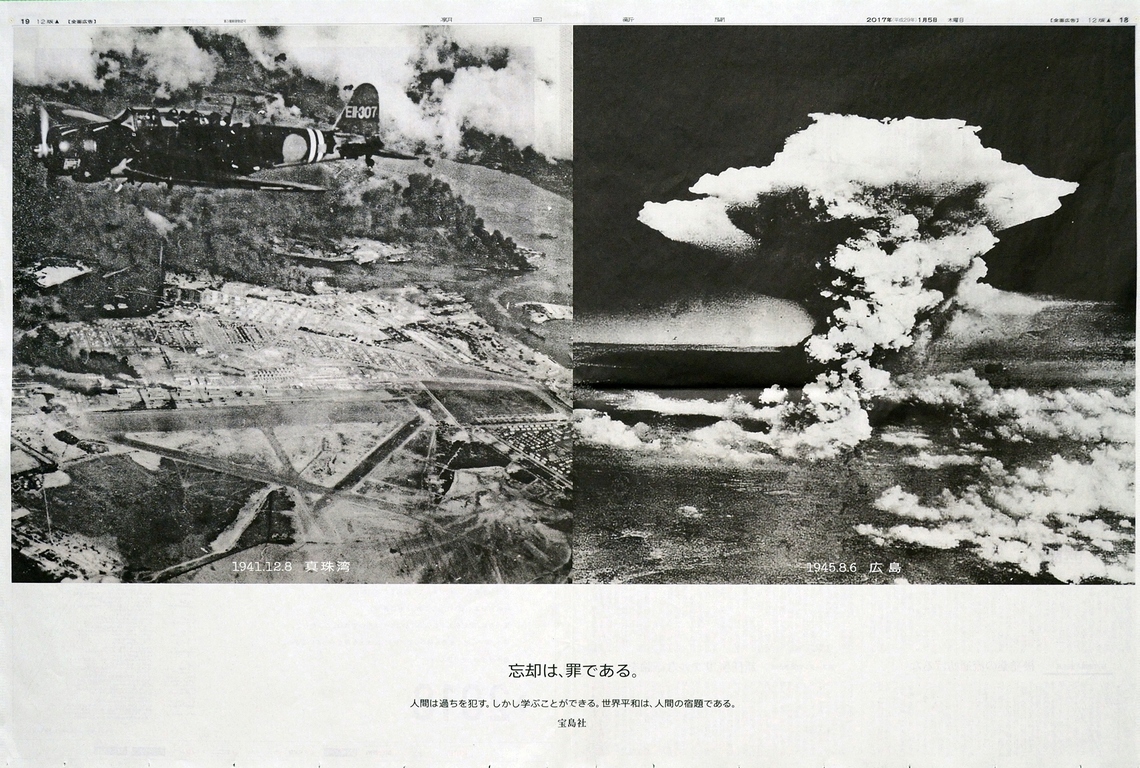 The advertisement occupied a 15-column spread, featuring a historical photograph of the December 1941 attack on Pearl Harbor on the left half and a photograph of the August 1945 atomic bombing of Hiroshima on the right half.